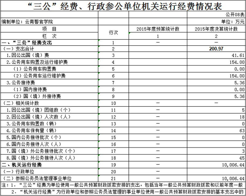 2015年因公出国(境)费用支出41.61万元,较2014年增加34.76万元。增加原因:云财预【2015】52号文下达我院出国专项经费支出23万元。我院加强了教师代表团出国交流工作。明细支出如下:a.学院赴泰国、缅甸交流团106538.69元;b.柬埔寨、老挝交流团44673.11元;c.参加公安部组团赴哥伦比亚参加世界警察运动大会83420元;d.学院赴加拿大不列颠哥伦比亚司法学院校际交流代表团137481.76,元;e.参加云南省教育厅组织云南省高校后勤赴台湾考察学习44070元。