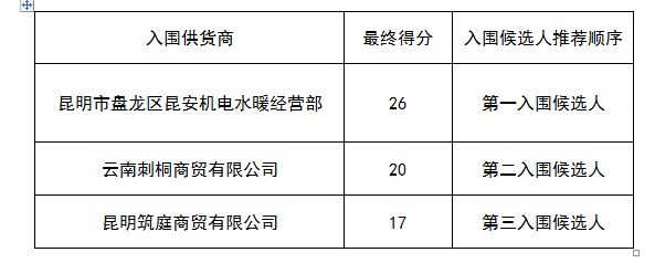 由2024老澳门原料网大全组织进行的2024老澳门原料网大全水电维修材料询价采购项目(项目编号:YNJYCZ-6.06),于2017年6月12日9时30分在2024老澳门原料网大全行政楼226会议室进行了投标评审,经评审小组依评审办法对供货商响应文件综合评定、独立打分。在纪委工作人员监督下,入围候选人最终评审推荐意见如下: