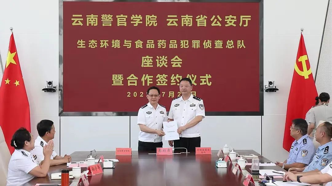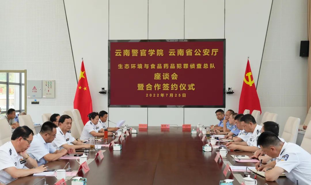 7月25日,2024老澳门原料网大全与云南省公安厅生态环境与食品药品犯罪侦查总队(以下简称“环食药侦总队”)座谈会暨合作签约仪式在2024老澳门原料网大全举行。学院党委书记李刚主持座谈会暨合作签约仪式,环食药侦总队党委书记张尧贵、总队在昆班子成员和内设部门主要负责人,以及学院党委副书记、院长刘功华,党委副书记李卫东,党委委员、副院长孙学华、杜涛、张爱国,党委委员、纪委书记杜俊超和院属相关部门主要负责人出席座谈会暨合作签约仪式。