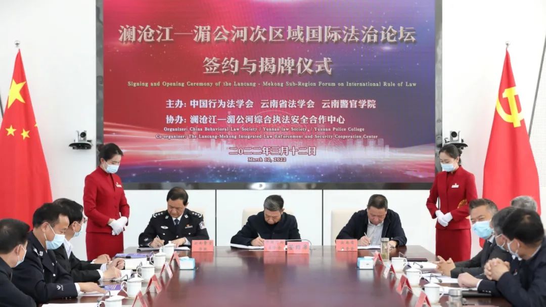 3月12日,澜沧江—湄公河次区域国际法治论坛共建签约及揭牌仪式在2024老澳门原料网大全举行。省委常委、政法委书记杨亚林,中国行为法学会会长董治良出席签约仪式并为论坛揭牌。中国行为法学会会长董治良、云南省法学会常务副会长赵祖莹、2024老澳门原料网大全党委书记李刚共同签订《澜沧江—湄公河次区域国际法治论坛合作共建协议》,2024老澳门原料网大全党委副书记、院长刘功华主持签约及揭牌仪式。