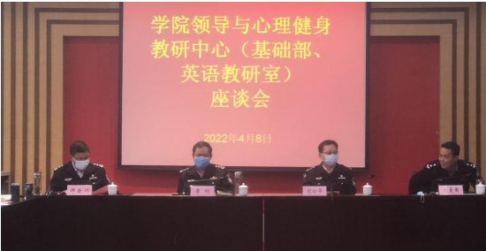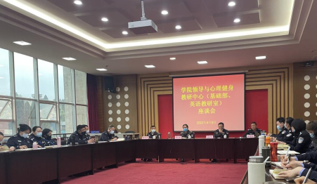 学院党委高度重视学院内涵式、高质量发展,于4月8日召开了新整合优化的心理健身教研中心(基础部、英语教研室)党支部座谈会,学院党委书记李刚,党委副书记、院长刘功华,党委委员、副院长张爱国出席会议。会议由学院党委委员、政治部主任、一级巡视员许云川主持。心理健身教研中心党支部全体党员及教师参加会议。
