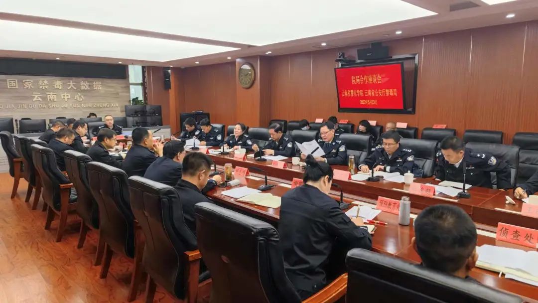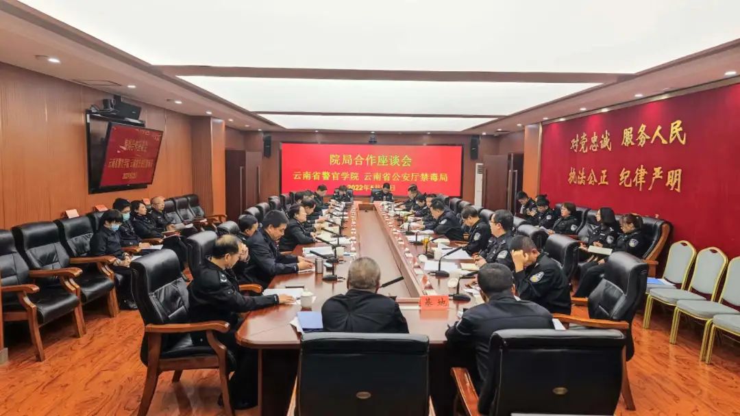 为实现教学科研内涵式高质量发展,助推学院创建全国重点公安院校,2022年5月23日上午,李刚书记率学院党委班子成员、相关部门干部教师赴云南省公安厅禁毒局,就进一步推进落实“院局合作”建设工作进行调研座谈,学院相关部门及禁毒局各业务处室负责同志参加座谈。