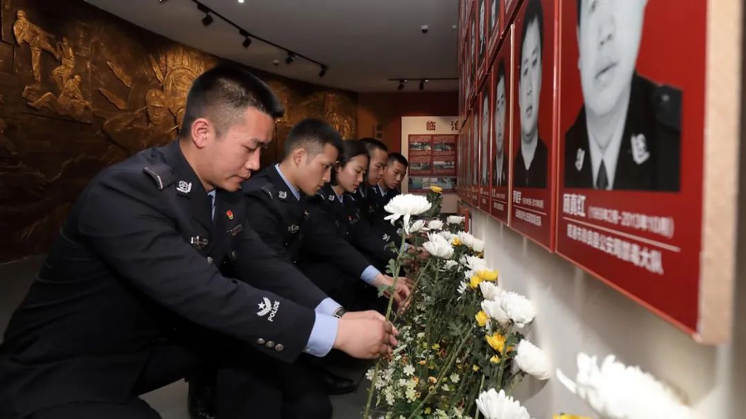 一大早,参加活动的师生集队来到省禁毒教育基地,共同缅怀曾经并肩战斗的战友和前辈,追思他们用生命和信仰书写的英雄事迹。英烈纪念墙前,大家肃穆伫立,手捧菊花,为英勇献身的公安英烈默哀、鞠躬,深情缅怀、寄托哀思。