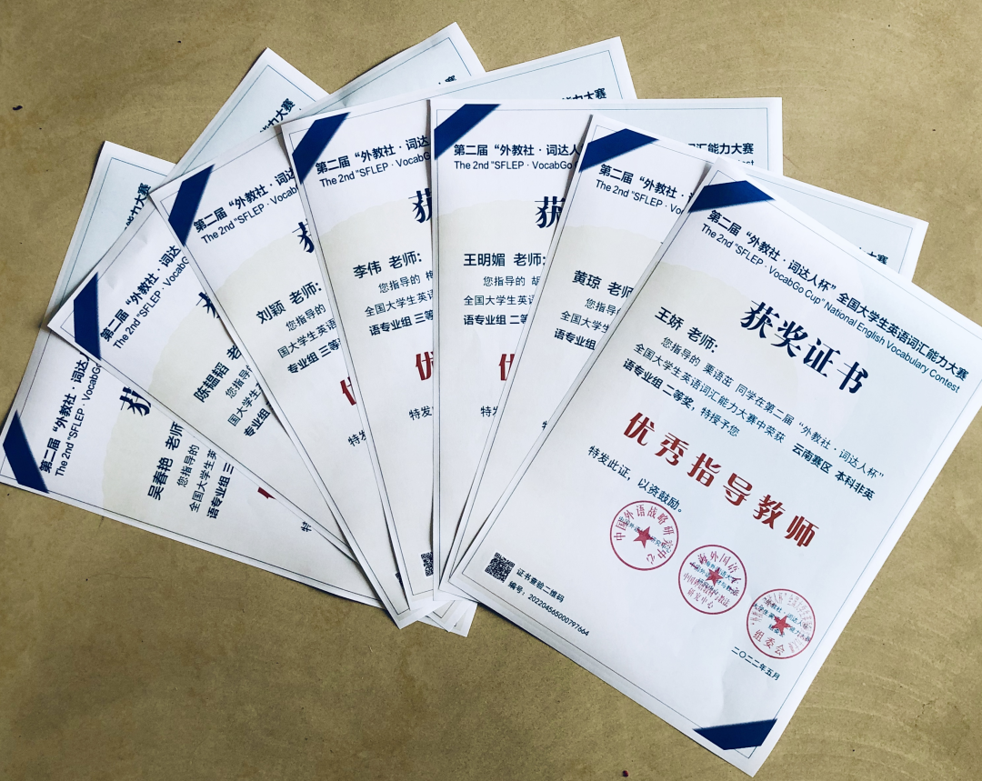 第二届“外教社·词达人杯”全国大学生英语词汇能力大赛于2022年5月至6月进行,全省22所高校,19621人参加了比赛。经过激烈角逐,我院治安学专业大队胡榆月、刑事侦查专业大队王晨甜、法学专业大队栗语茁获得云南赛区二等奖;法学专业大队梅欣怡、左艾、王佳雪,信息网络安全专业大队王凯获得云南赛区三等奖。英语教研室吴春艳、黄琼、陈韫韬、李伟、王娇、刘颖、王明媚7位教师获得“优秀指导教师”称号。