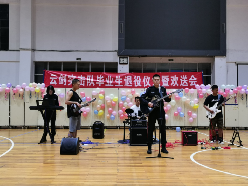 青春不散场,未来犹可期。五指山乐队用充满力量的《河流》、《YELLOW》演唱拉开了此次活动的帷幕。云剑突击队二中队防爆棍表演,以凌厉的砍劈挑击、灵活多变的步伐转换获得了现场观众的热烈掌声;一中队以坚毅的眼神、敏捷的动作和铿锵的口号在倒功表演中诠释着汗水与付出,展示着云剑突击的利剑精神;全体队员整齐划一的“形意拳”表演,将活动推向高潮。