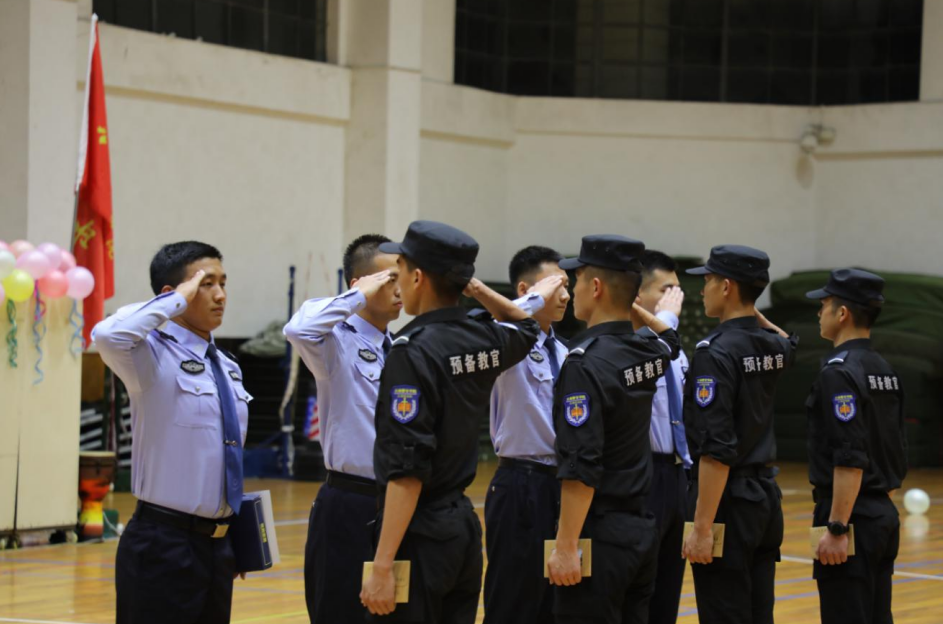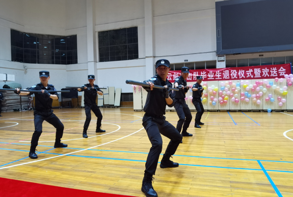 在退“役”仪式环节,伴随着嘹亮的军歌毕业生迈着铿锵的步伐走向舞台中央,并送上他们在“云剑”的最后一个敬礼,师弟接过他们手中云剑突击队标识,他们心中饱含不舍和眷念,一腔热血、加入云剑,四年青春、退出现役,大家不禁眼眶泛起泪花。“学承于师,受教于师”,警体部副主任佘军奇代表老师们向退役的4名毕业生送上纪念品及祝福,同时勉励现役队员努力学习、锐意进取、刻苦训练、淬炼本领,不负青春,不负韶华,努力成为优秀的警务实战教官和特警尖刀利剑,并向参加云南省区域教官扩容班获得省级区域教官证书的4名队员表示祝贺。