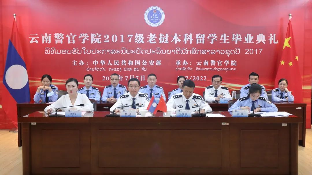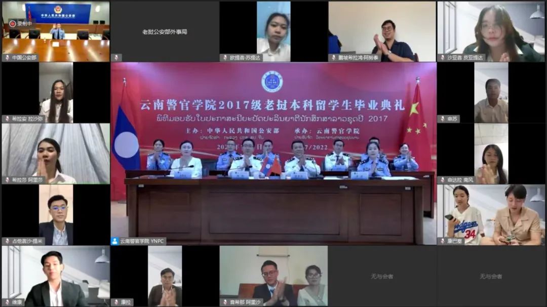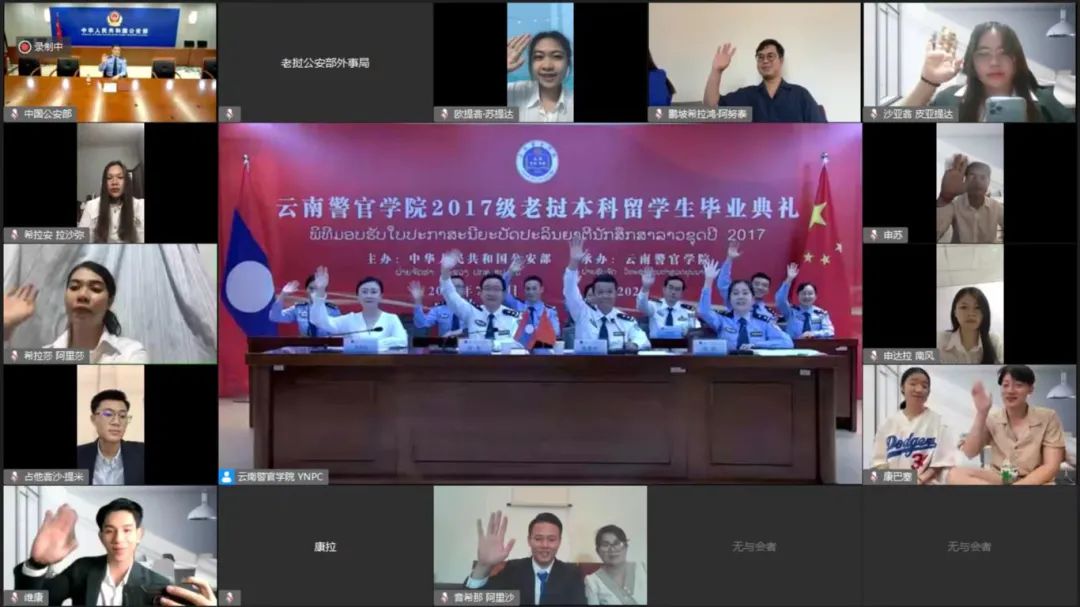 7月7日上午,由中国公安部主办,2024老澳门原料网大全承办的“2017级老挝本科留学生培养项目”线上毕业典礼在学院举行,中国公安部国际合作局十一处处长穆光出席毕业典礼并致辞,2024老澳门原料网大全党委委员、副院长杜涛参加毕业典礼并讲话,2024老澳门原料网大全党委委员、副院长张爱国主持毕业典礼,老挝公安部外事局副局长博力、澜沧江湄公河综合执法安全合作中心执法能力建设部负责人、2024老澳门原料网大全教务处、法学院、国际警察教育培训学院部门负责人、教师代表、2017级12名老挝本科留学生及家人参加毕业典礼。