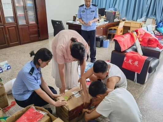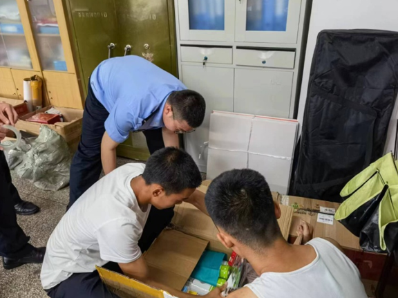 团队成员对“三下乡”活动物资进行整理装箱,并发放个人物资。