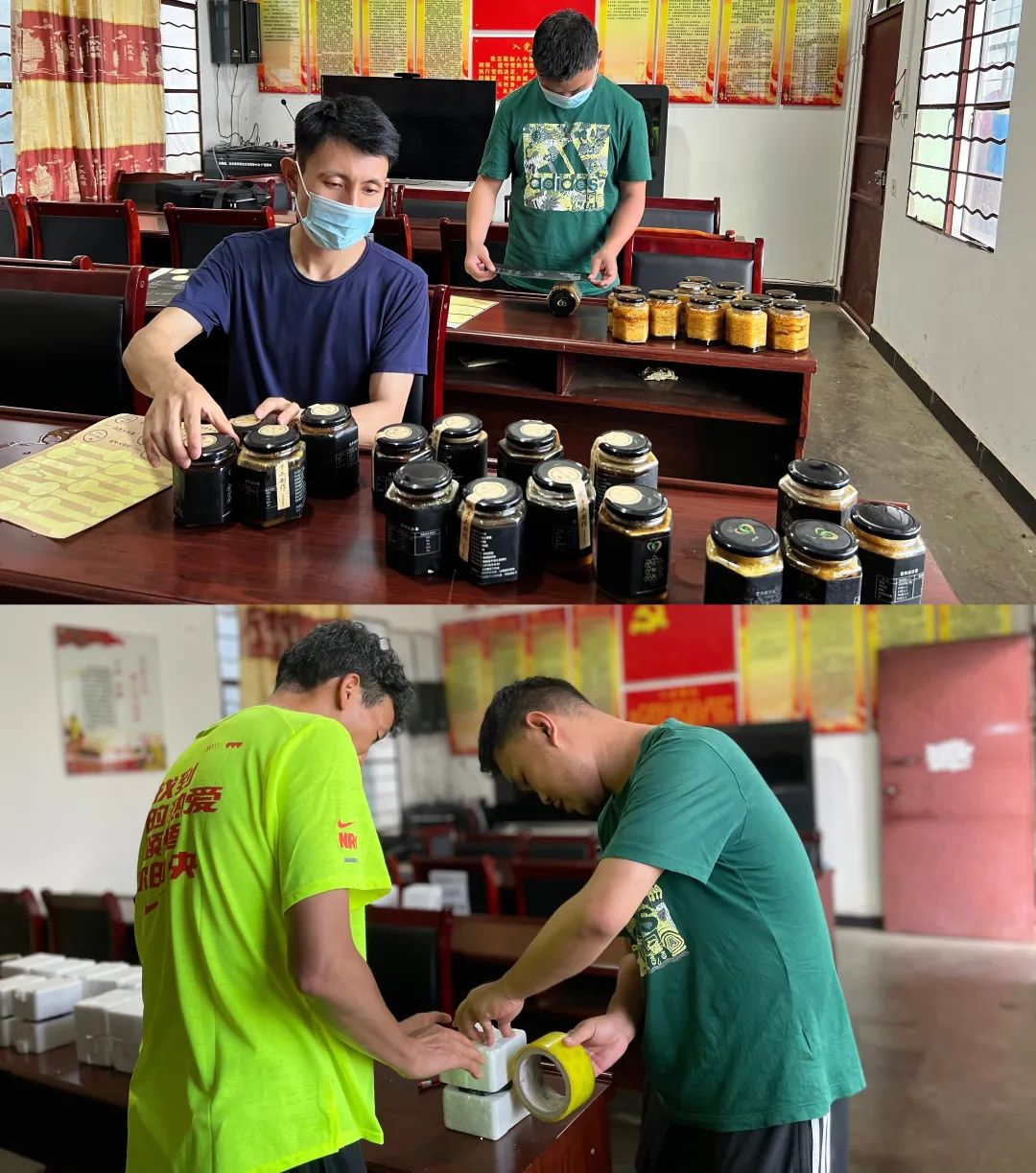 立足本村特色资源,推动一二三产业融合发展,发展壮大新型农村集体经济、拓展农民增收空间,木场乡龙塘村驻村第一书记刘东海及队员许兴华、杨帆正在为本村蜂蜜加工合作社包装产品。