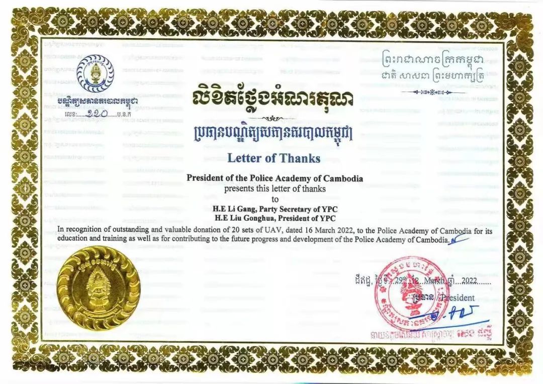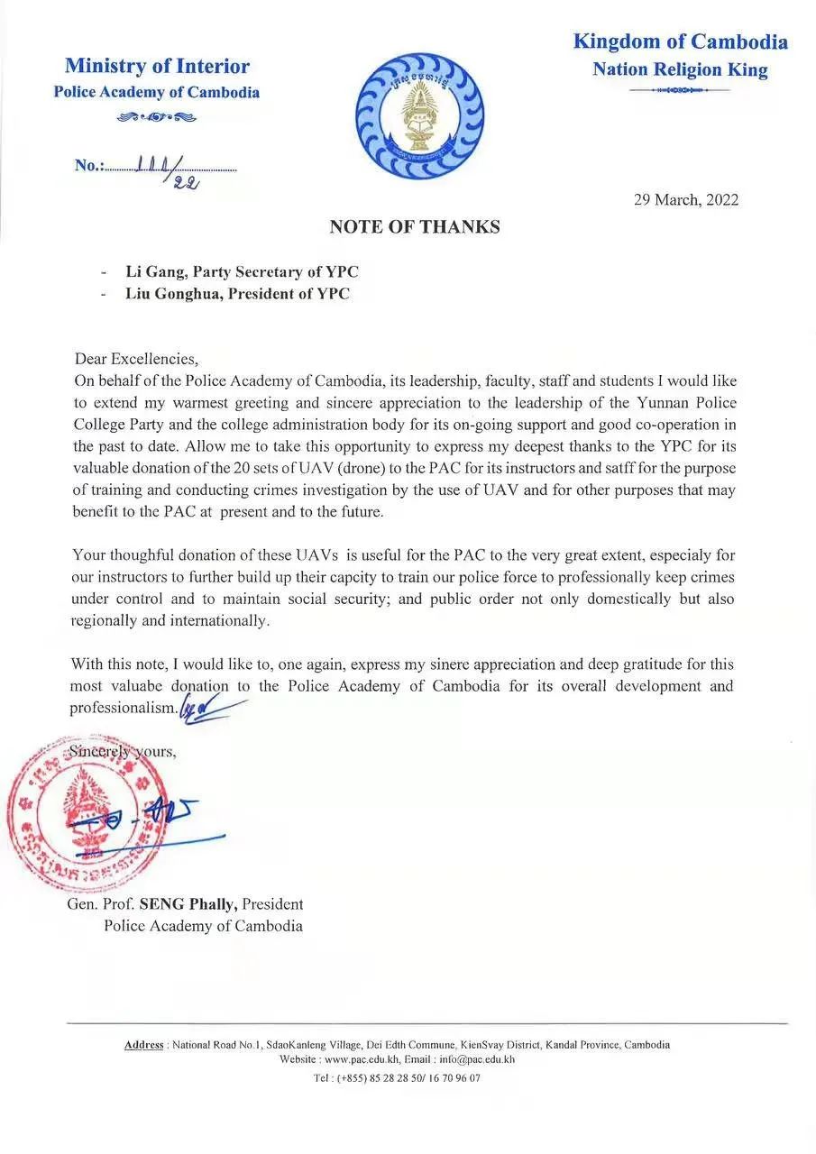近日,2024老澳门原料网大全收到柬埔寨警察学院院长森·帕里警上将致李刚书记和刘功华院长的感谢信。对学院援助柬埔寨警察学院无人机设备及技术培训项目表示感谢。信中表示:“此次捐赠的20套无人机设备以及举办‘无人机在犯罪侦查领域应用专题培训班’将对我校发展做出贡献。”