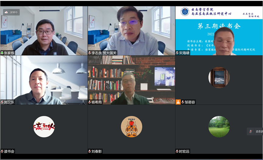 本期读书会特别邀请了中国国际问题研究院杨希雨研究员、中国社会科学院美国研究所刘卫东研究员、对外经贸大学国际关系学院李志永教授为我们解读当前中美关系。中心第一届专家委员会委员、院属各部门部分教师、省厅相关民警线上参会。