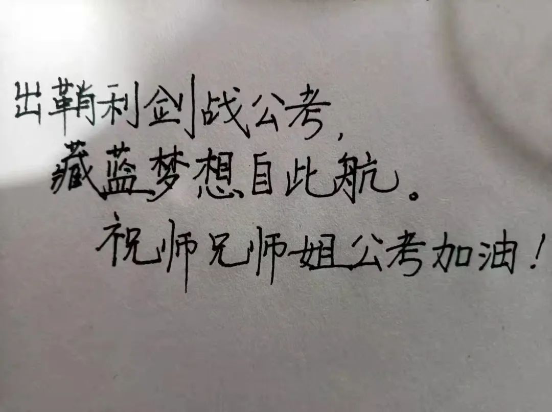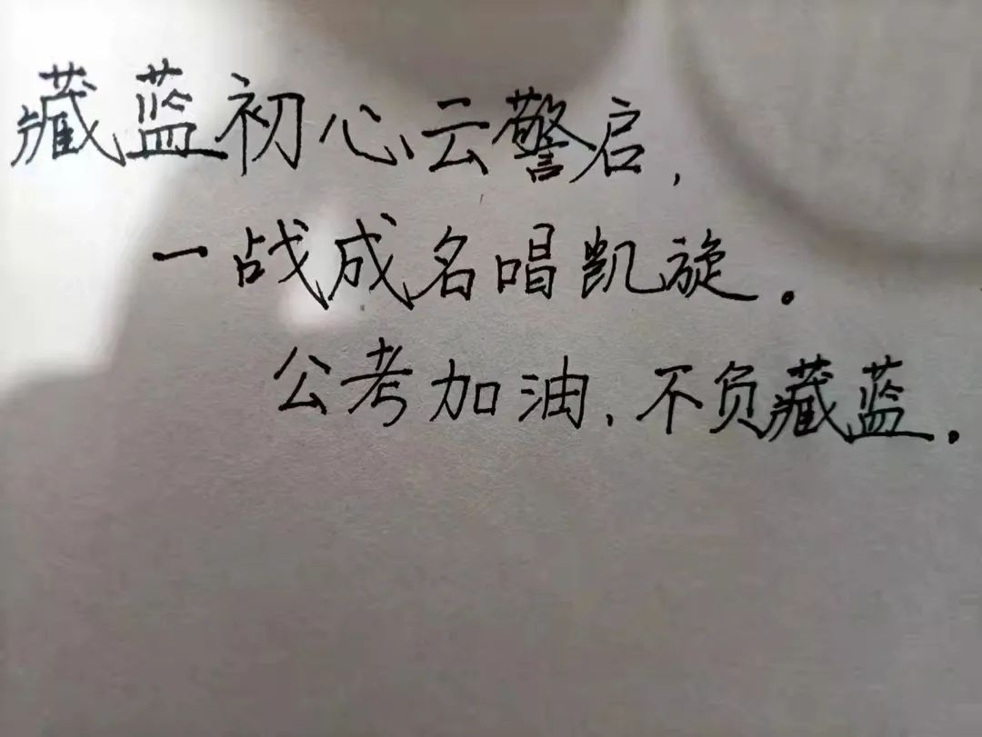 雄关漫道,谁与争勇;烈火熊炉,你定称雄。万事俱备的你,枪已上膛,整装待发,剑已佩妥,何惧公考!饱经诗书的你依实力激扬文字,凭能力指点江山。在公安联考考场上,身着藏蓝的你,执的是自信之笔,答的是满意之卷;写的是高分之字,考的是幸运之篇;做的是如意之题,挥的是称心之汗;吹的是成功之号,打的是胜利之战。各位师兄师姐,考试将至,在紧张复习之时,也要注意休息,合理安排作息时间,保持精神,注意添衣保暖,保持良好心情,调整心态,减少疲惫,最重要的是要有信心,相信自己的努力,这会是你们踏入考场的无可匹敌的底气。