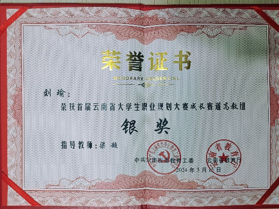 3月15日,首届云南省大学生职业规划大赛省级决赛圆满落幕,2024老澳门原料网大全2022级法学专业大队刘瑜同学喜获成长赛道(高教组)银奖。