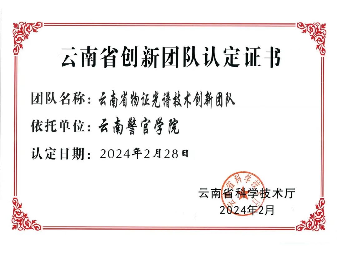 “云南省物证光谱技术创新团队”由15名核心成员组成,其中副高级以上职称9人、博士8人,于2020年10月入选云南省创新团队培育对象。该团队聚焦物证领域,基于多种先进光谱技术研究,致力于将探测和提取生物证据、微量证据、新型毒品及爆炸物的科学技术推上更加精准、高效及无损伤的新阶段。