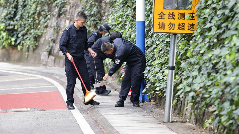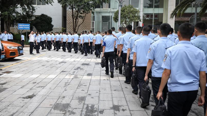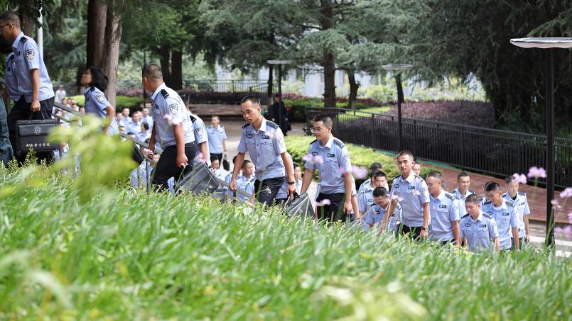 7:30,学警们集合完毕,踏着整齐的步伐,列队前往各个教室。