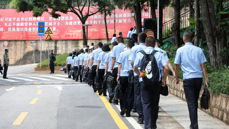 12:00,上午的学习结束,午餐时间到,学警们列队前往食堂。